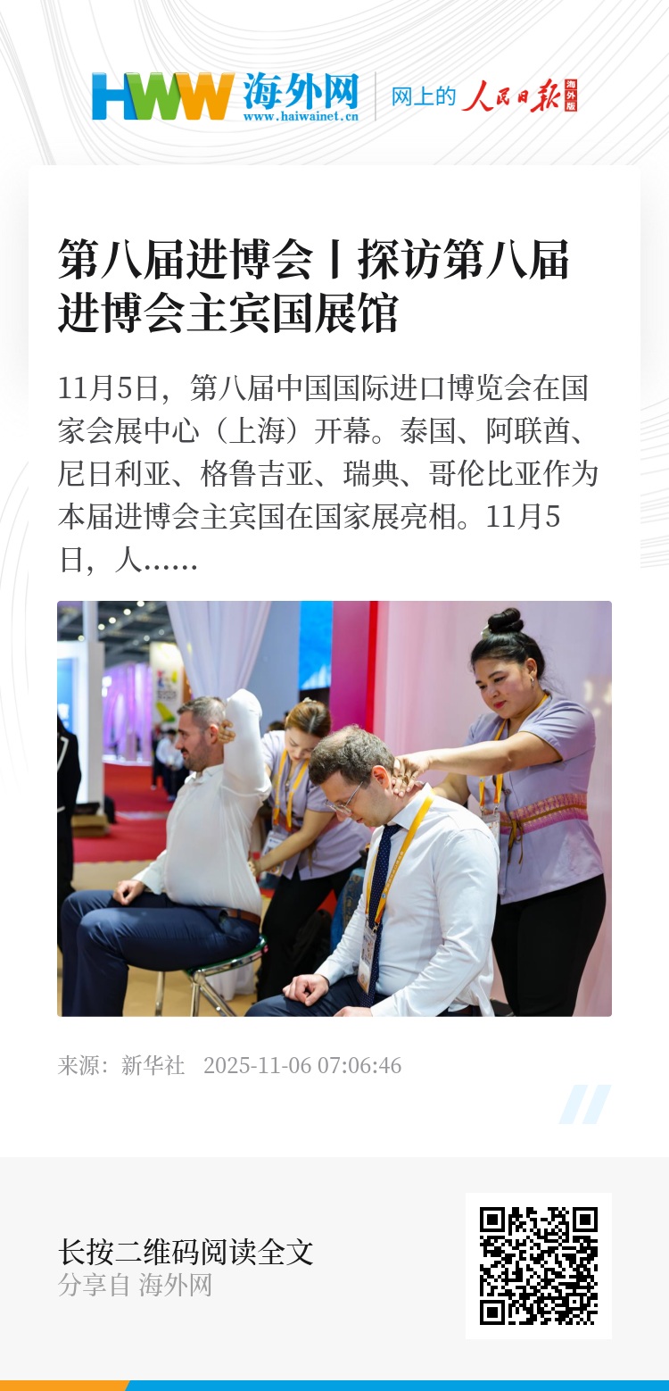 11月5日,人们在第八届进博会国家展泰国馆体验泰式按摩。新华社记者 王泽聪 摄