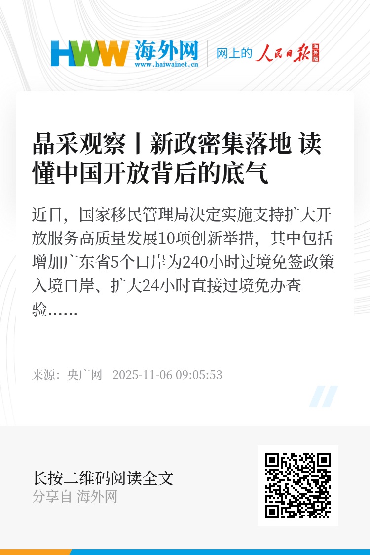 总之,从“通”到“畅”,“新政”力度之大、便利之深,不仅方便中国公民出入境,也为境外人员来华创造更便利的条件。这也为正在上海举办的第八届中国国际进口博览会搭建了便捷的桥梁,全球商家赴华参展、洽谈合作的准入门槛更低、流程更顺畅。截至目前,已有4108家境外企业确认参展,充分彰显出中国超大规模市场对全球合作伙伴的强大吸引力,成为全球共享的重要发展机遇。