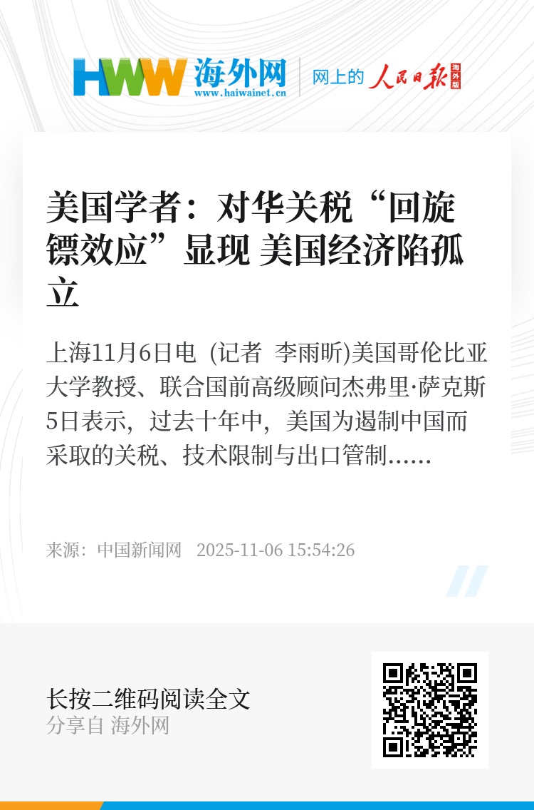 中新网上海11月6日电 (记者 李雨昕)美国哥伦比亚大学教授、联合国前高级顾问杰弗里·萨克斯5日表示,过去十年中,美国为遏制中国而采取的关税、技术限制与出口管制等举措,并未达成预期目标,反而产生“回旋镖效应”,使美国自身经济陷入孤立。