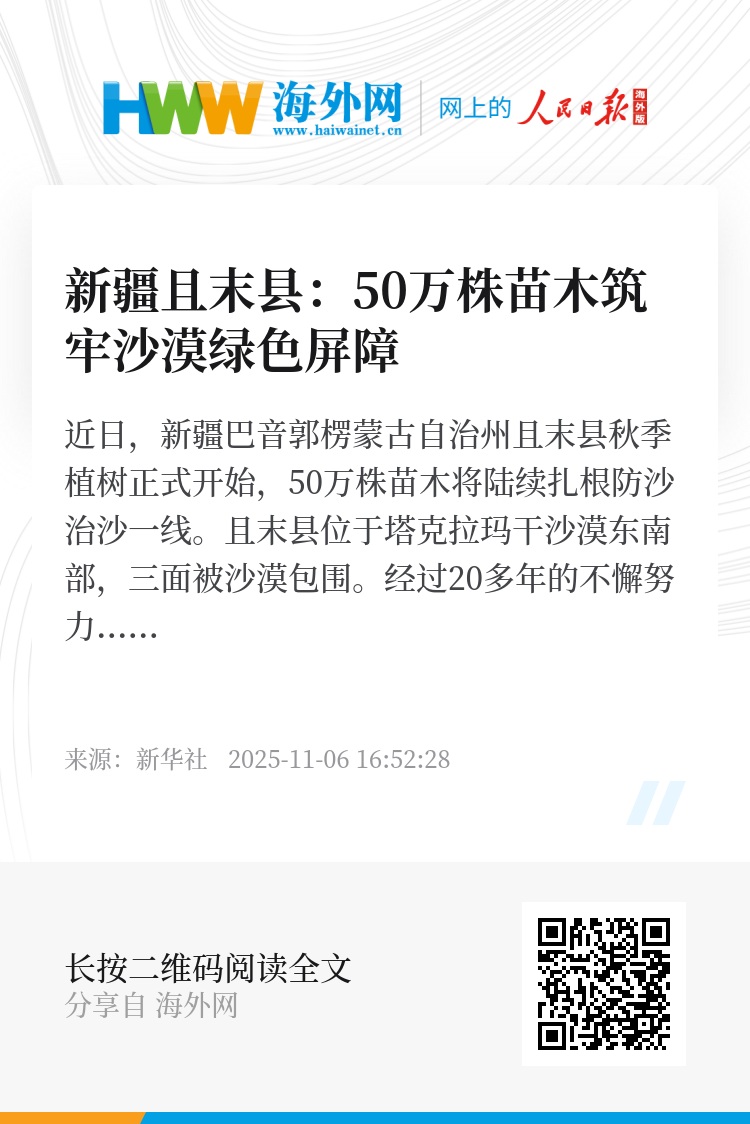 近日,新疆巴音郭楞蒙古自治州且末县秋季植树正式开始,50万株苗木将陆续扎根防沙治沙一线。
