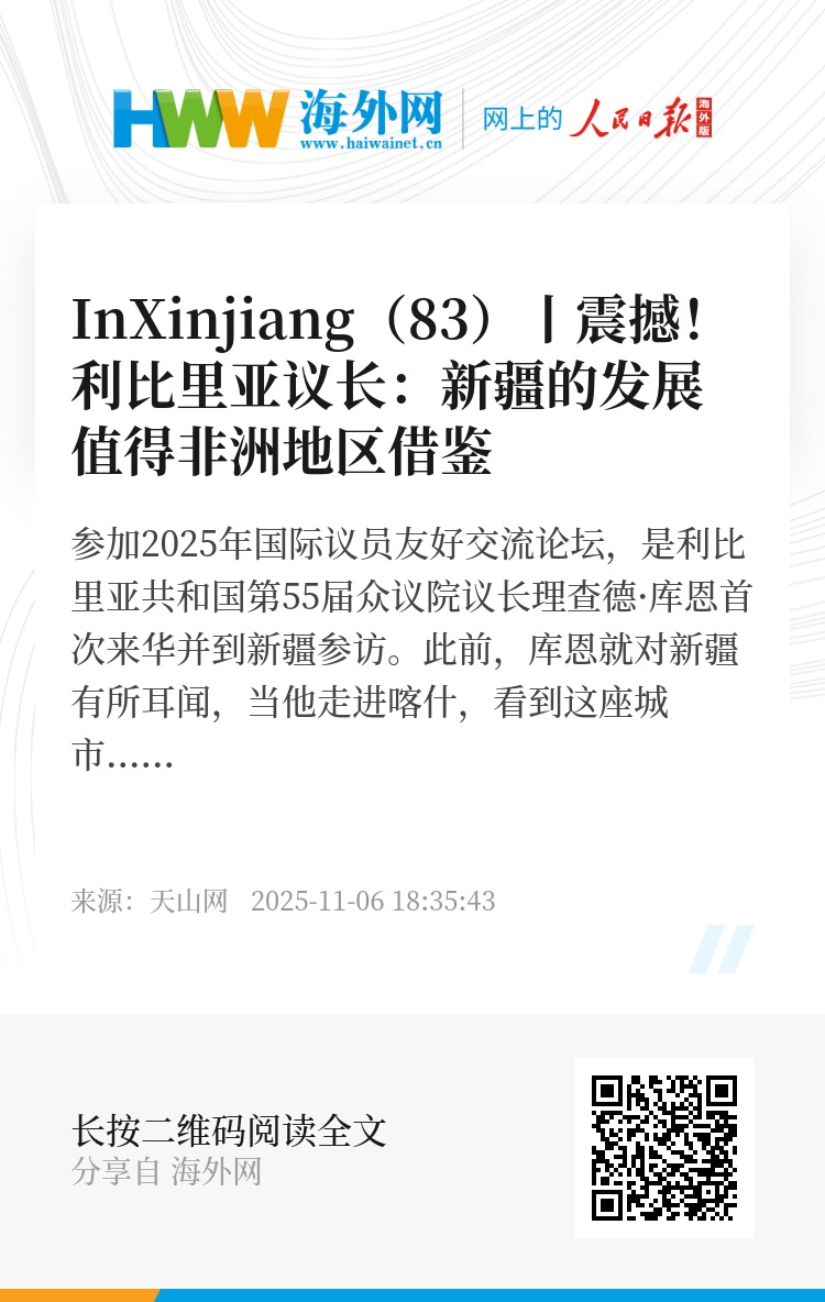 参加2025年国际议员友好交流论坛,是利比里亚共和国第55届众议院议长理查德·库恩首次来华并到新疆参访。此前,库恩就对新疆有所耳闻,当他走进喀什,看到这座城市从古城蜕变为现代化都市,他深感震撼,直言中国致力于为人民谋福祉,希望能将这些成功经验带回利比里亚。