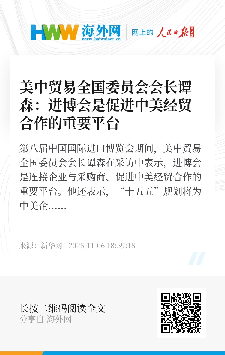第八届中国国际进口博览会期间,美中贸易全国委员会会长谭森在采访中表示,进博会是连接企业与采购商、促进中美经贸合作的重要平台。他还表示,“十五五”规划将为中美企业扩大合作创造新的机遇。
