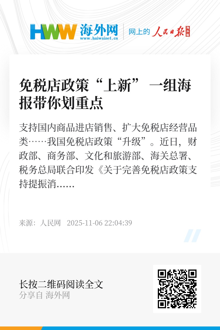 支持国内商品进店销售、扩大免税店经营品类……我国免税店政策“升级”。近日,财政部、商务部、文化和旅游部、海关总署、税务总局联合印发《关于完善免税店政策支持提振消费的通知》,从大力支持国货、扩容经营品类、放宽审批权限、提供便利服务等多方面,努力满足出入境旅客多层次、多样化的购物需求,提升旅客免税购物体验。一组海报带你划重点。