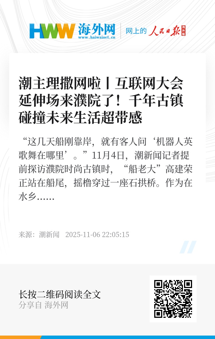“这几天船刚靠岸,就有客人问‘机器人英歌舞在哪里’。”11月4日,潮新闻记者提前探访濮院时尚古镇时,“船老大”高建荣正站在船尾,摇橹穿过一座石拱桥。作为在水乡摇了多年船的老濮院人,这些天他明显感到古镇的“节奏”变了——青石板路上多了机器狗的金属脚步声,茶馆里的茶客开始讨论“AI看面相”,就连夜晚的灯笼光,都和蓝色的科技光束在巷弄里交织。