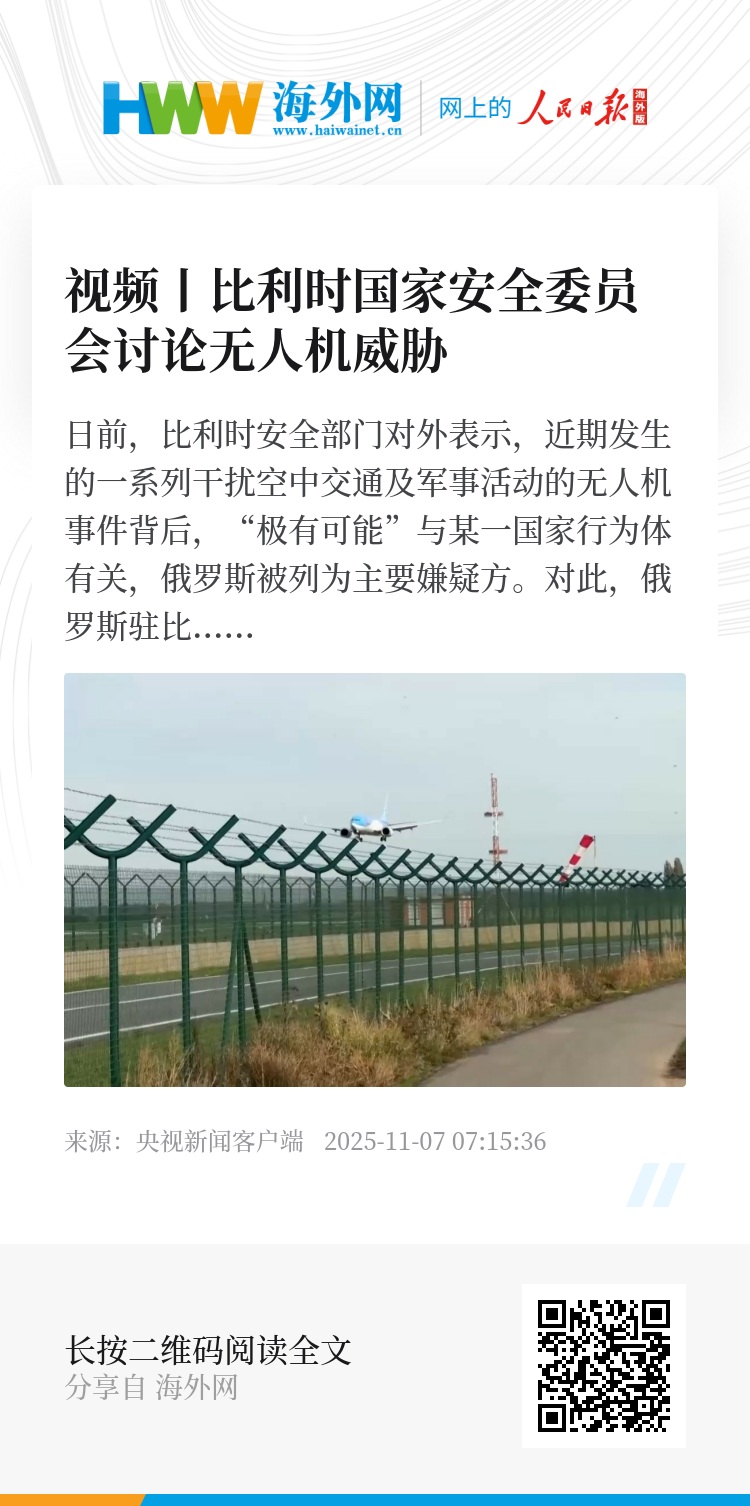 6日,比利时国家安全委员会召开紧急会议,讨论无人机威胁问题。比利时防长弗兰肯在会后表示,政府计划尽快启用国家空域安全中心。他指出,比利时目前已设有空域监控机构,但随着无人机活动频发,陆海空三军需要更加紧密的协同机制,以提高应对效率。