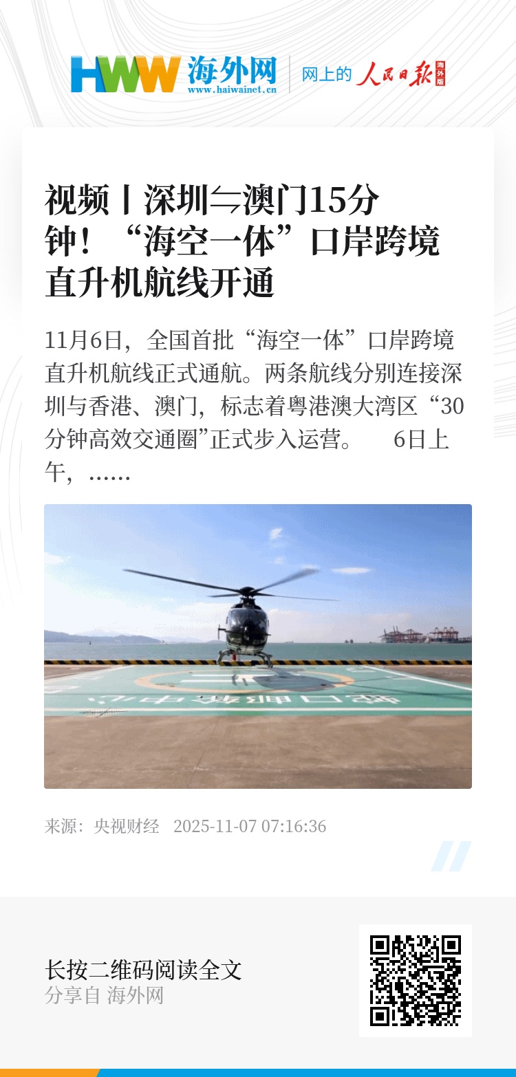 11月6日,全国首批“海空一体”口岸跨境直升机航线正式通航。两条航线分别连接深圳与香港、澳门,标志着粤港澳大湾区“30分钟高效交通圈”正式步入运营。