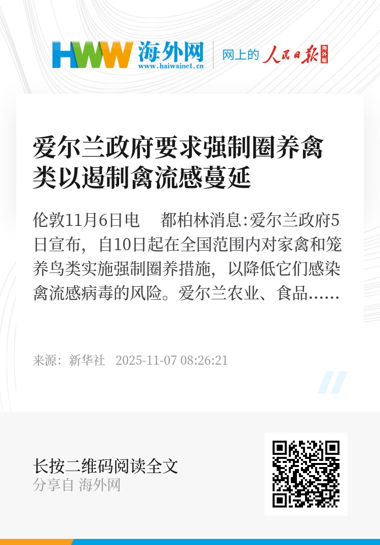 新华社伦敦11月6日电 都柏林消息:爱尔兰政府5日宣布,自10日起在全国范围内对家禽和笼养鸟类实施强制圈养措施,以降低它们感染禽流感病毒的风险。