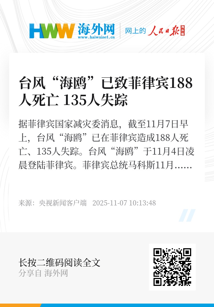 据菲律宾国家减灾委消息,截至11月7日早上,台风“海鸥”已在菲律宾造成188人死亡、135人失踪。