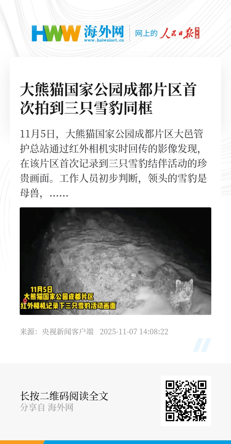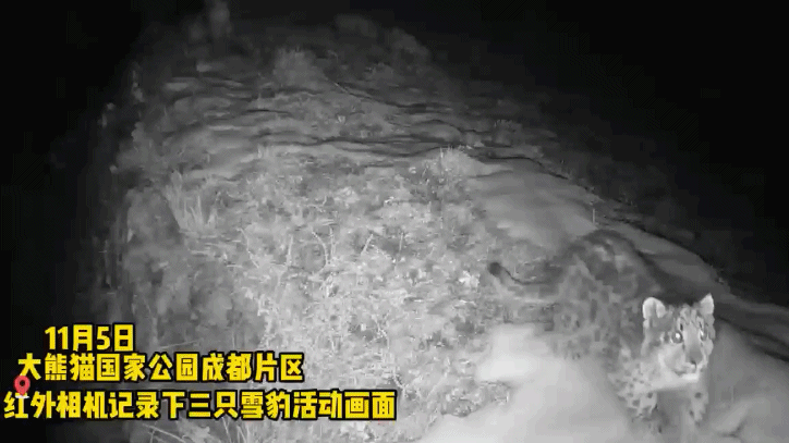 11月5日,大熊猫国家公园成都片区大邑管护总站通过红外相机实时回传的影像发现,在该片区首次记录到三只雪豹结伴活动的珍贵画面。工作人员初步判断,领头的雪豹是母兽,后面两只是它的幼崽。 10月19日,同一台红外相机也拍到了一只雪豹单独活动的影像。连续多次监测到雪豹踪迹,充分证明了大熊猫国家公园成都片区已经成为雪豹稳定活动的栖息地,这也是该区域生态系统完整、保护成效显著的有力佐证。(总台记者 张力)