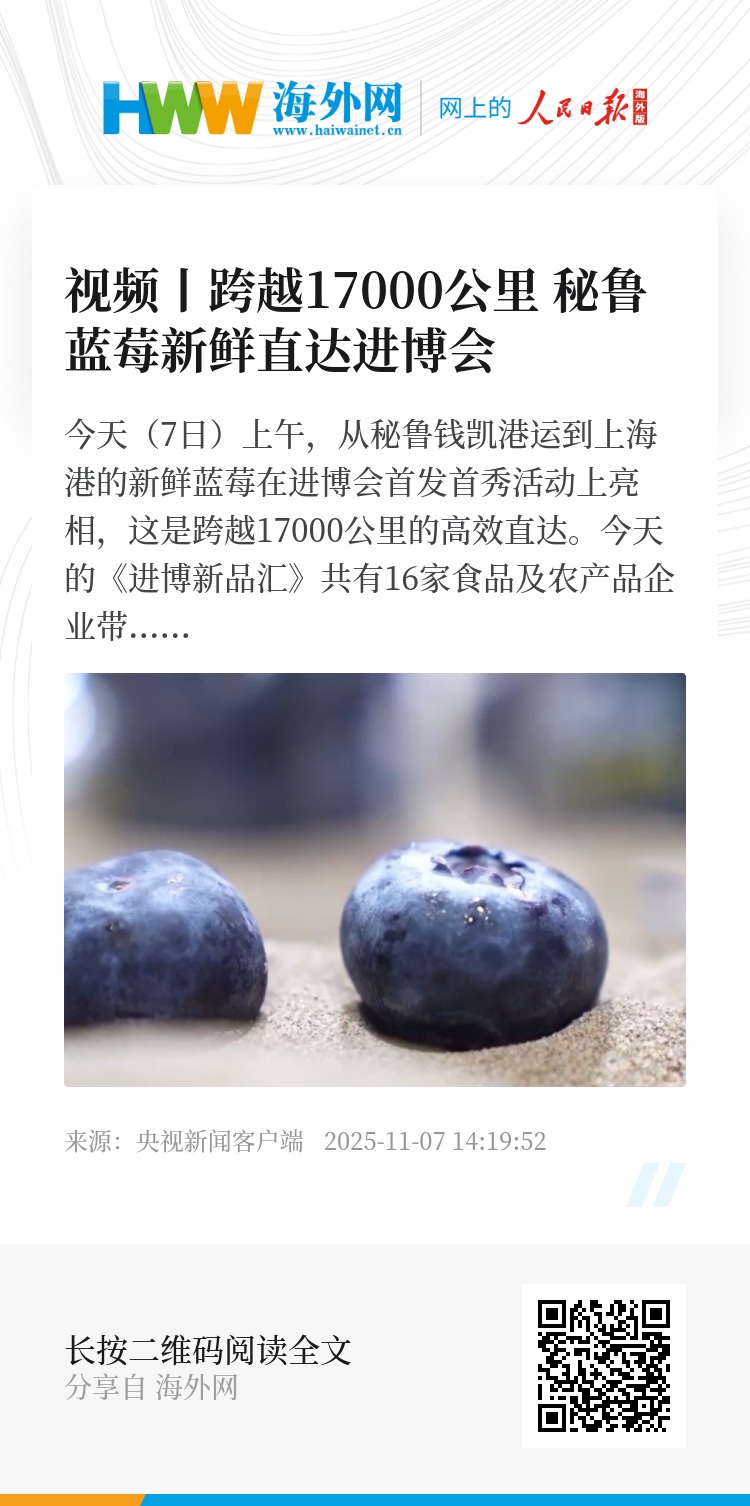 今天(7日)上午,从秘鲁钱凯港运到上海港的新鲜蓝莓在进博会首发首秀活动上亮相,这是跨越17000公里的高效直达。
