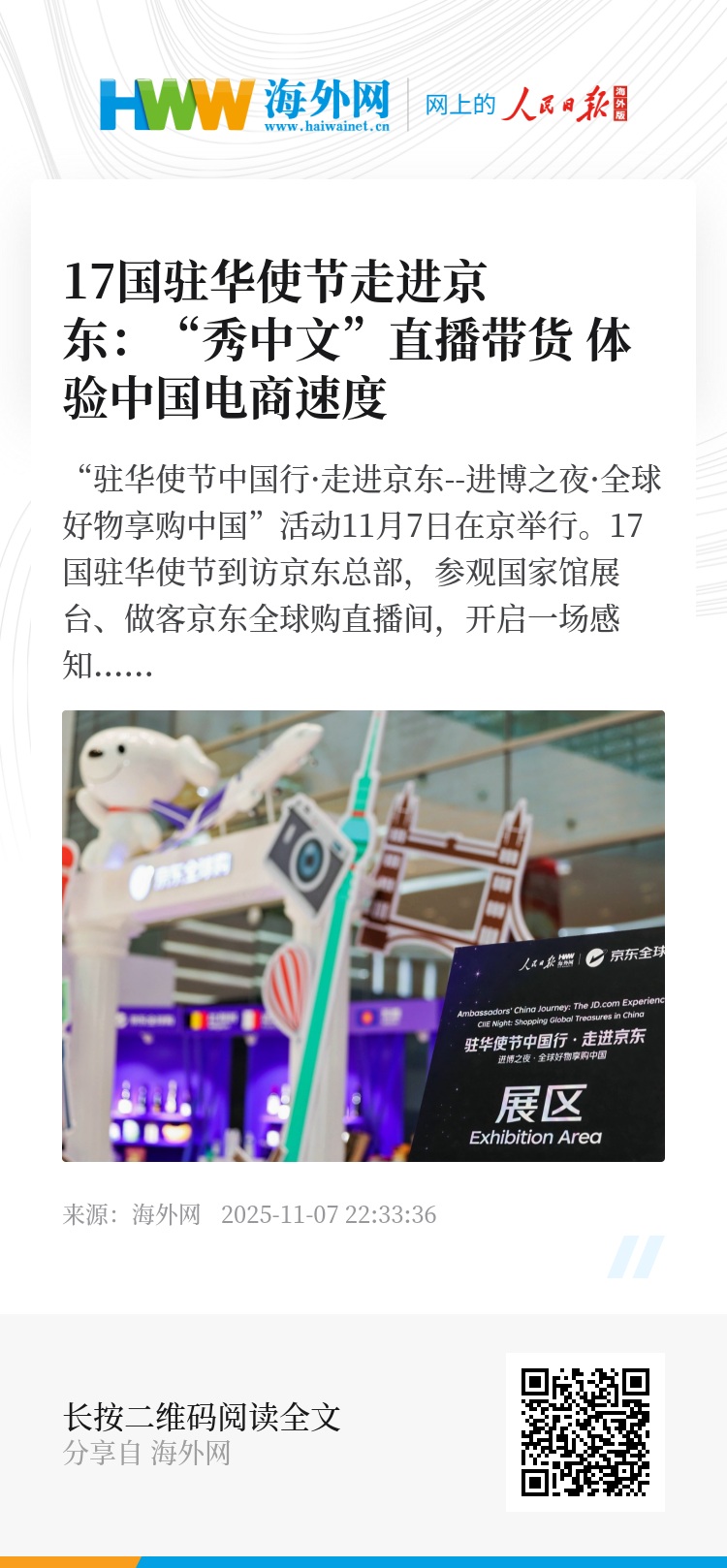 海外网11月7日电 “驻华使节中国行·走进京东--进博之夜·全球好物享购中国”活动11月7日在京举行。17国驻华使节到访京东总部,参观国家馆展台、做客京东全球购直播间,开启一场感知中国数字经济脉搏的探索之旅。