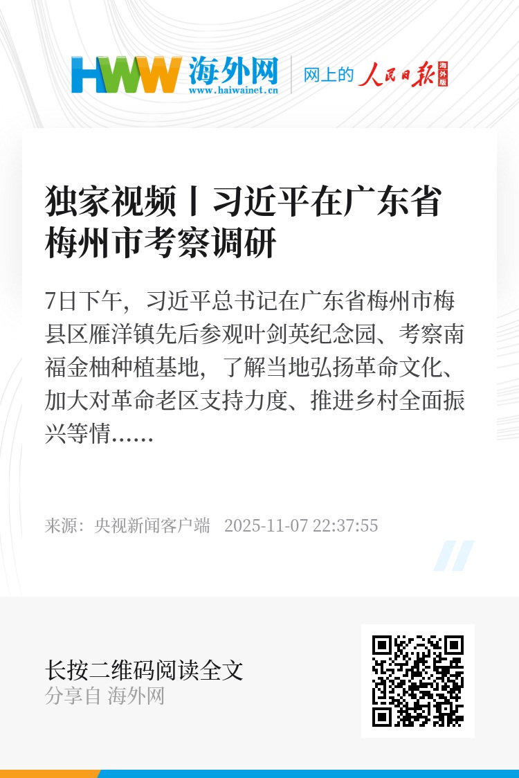 7日下午,习近平总书记在广东省梅州市梅县区雁洋镇先后参观叶剑英纪念园、考察南福金柚种植基地,了解当地弘扬革命文化、加大对革命老区支持力度、推进乡村全面振兴等情况。