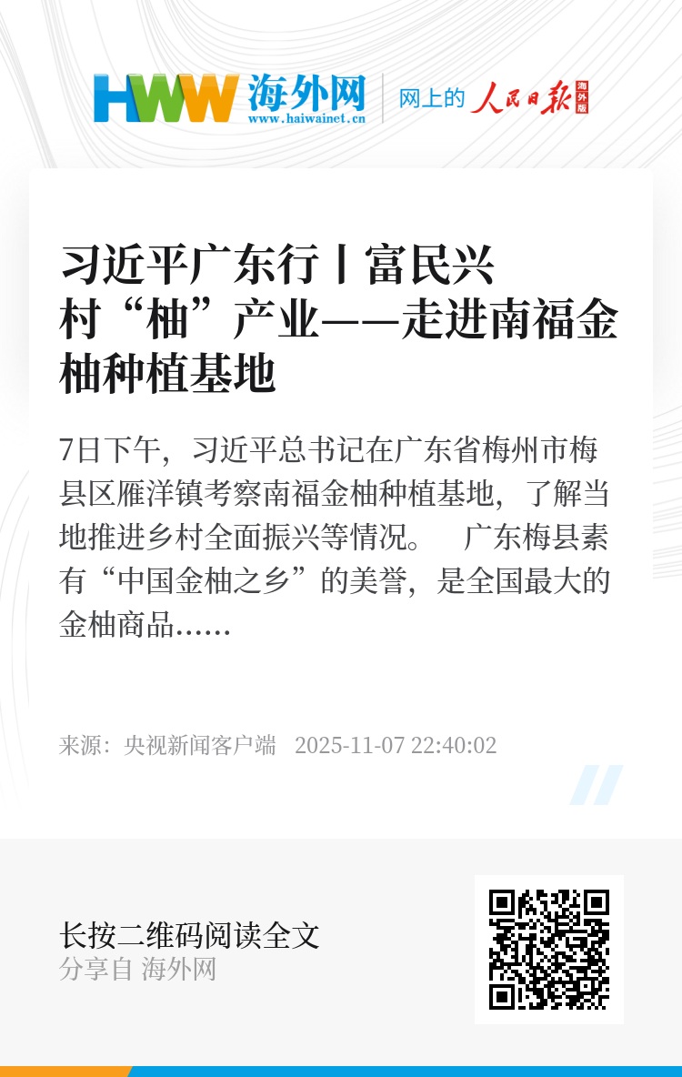 7日下午,习近平总书记在广东省梅州市梅县区雁洋镇考察南福金柚种植基地,了解当地推进乡村全面振兴等情况。