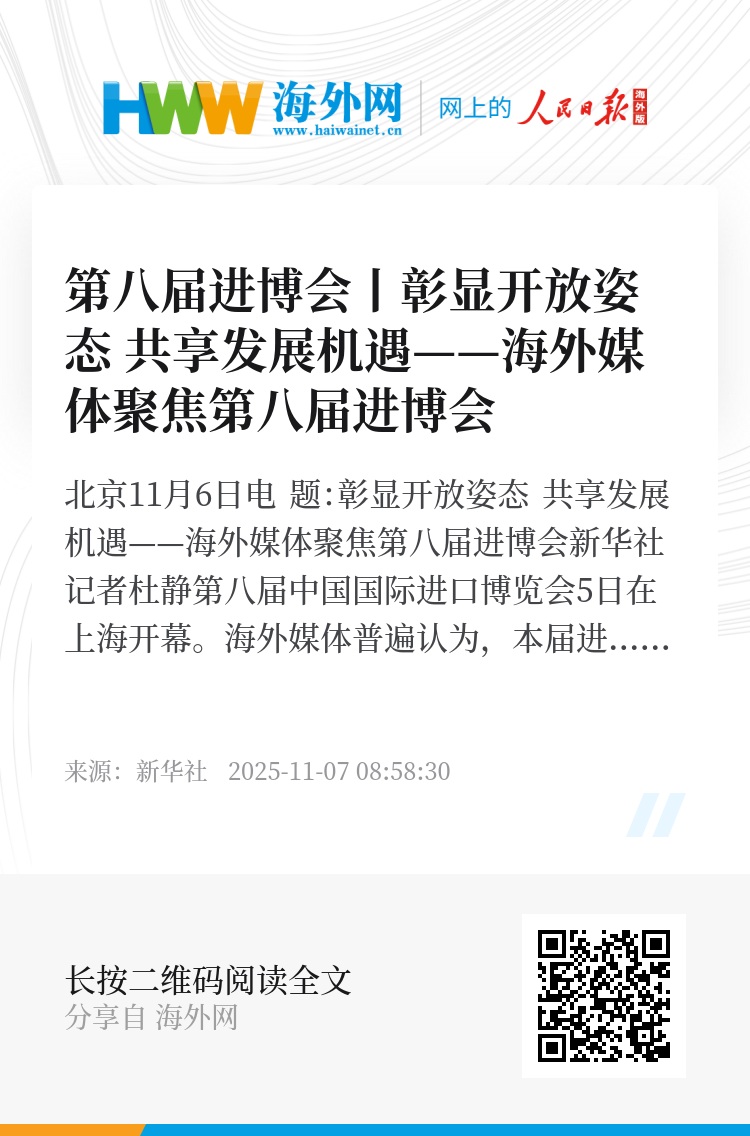 韩国《亚洲商业日报》报道指出,进博会印证了中国与全球经济深度融合、密不可分的发展大势,展示了中国扩大开放的决心。