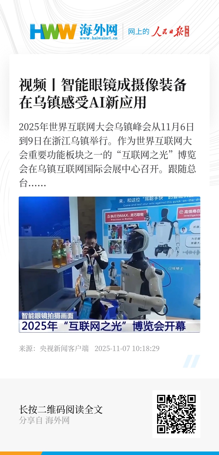 但今年有点不一样。因为今年的“互联网之光”博览会首次大规模设置了“人工智能+”体验区。下面跟随记者和他佩戴的AI“智能助手”一起沉浸式感受一下!