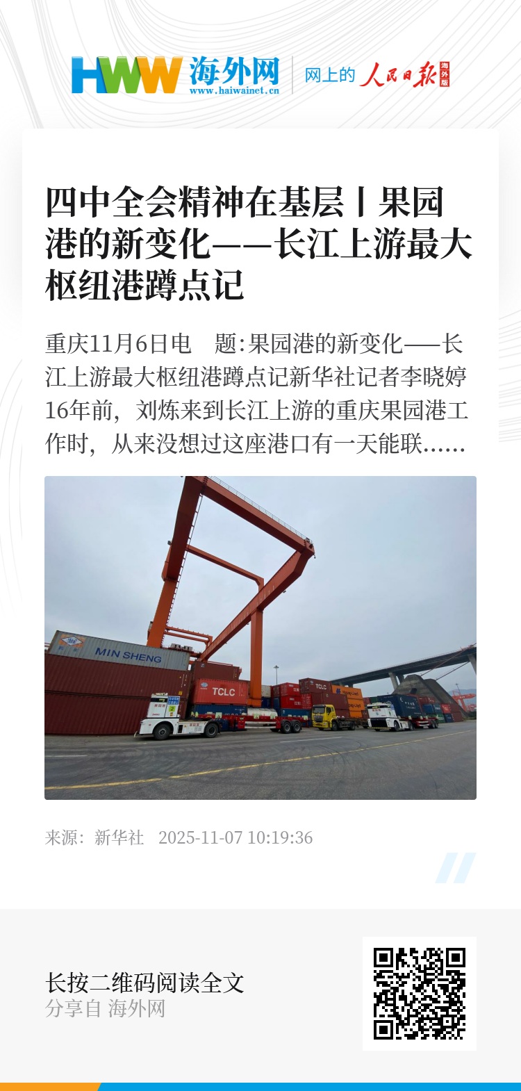 新华社重庆11月6日电 题:果园港的新变化——长江上游最大枢纽港蹲点记