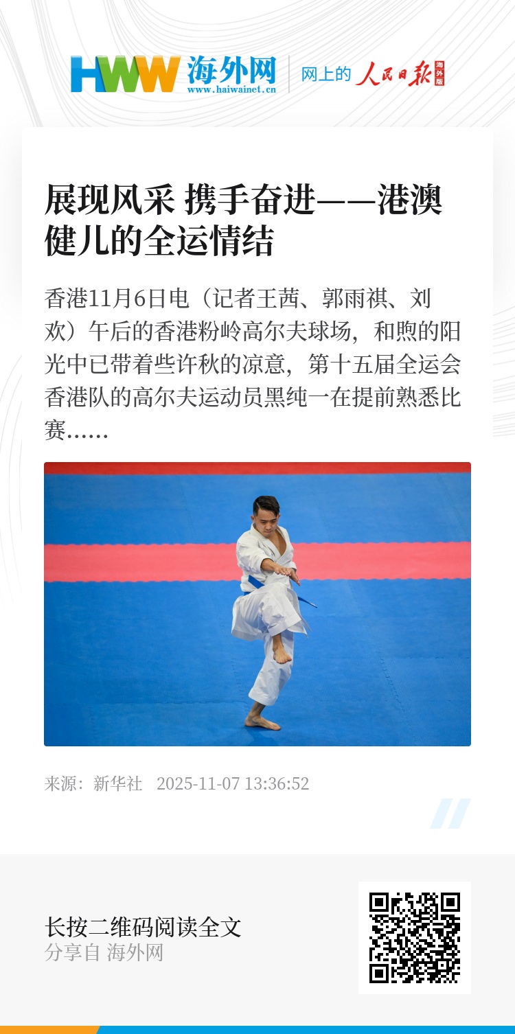 新华社香港11月6日电(记者王茜、郭雨祺、刘欢)午后的香港粉岭高尔夫球场,和煦的阳光中已带着些许秋的凉意,第十五届全运会香港队的高尔夫运动员黑纯一在提前熟悉比赛场地。从十多年前第一次参加全运会的兴奋到如今备战的从容,全运会于他而言早已超越赛事本身,成为运动员们展现风采、携手奋进、传递体育精神的平台。