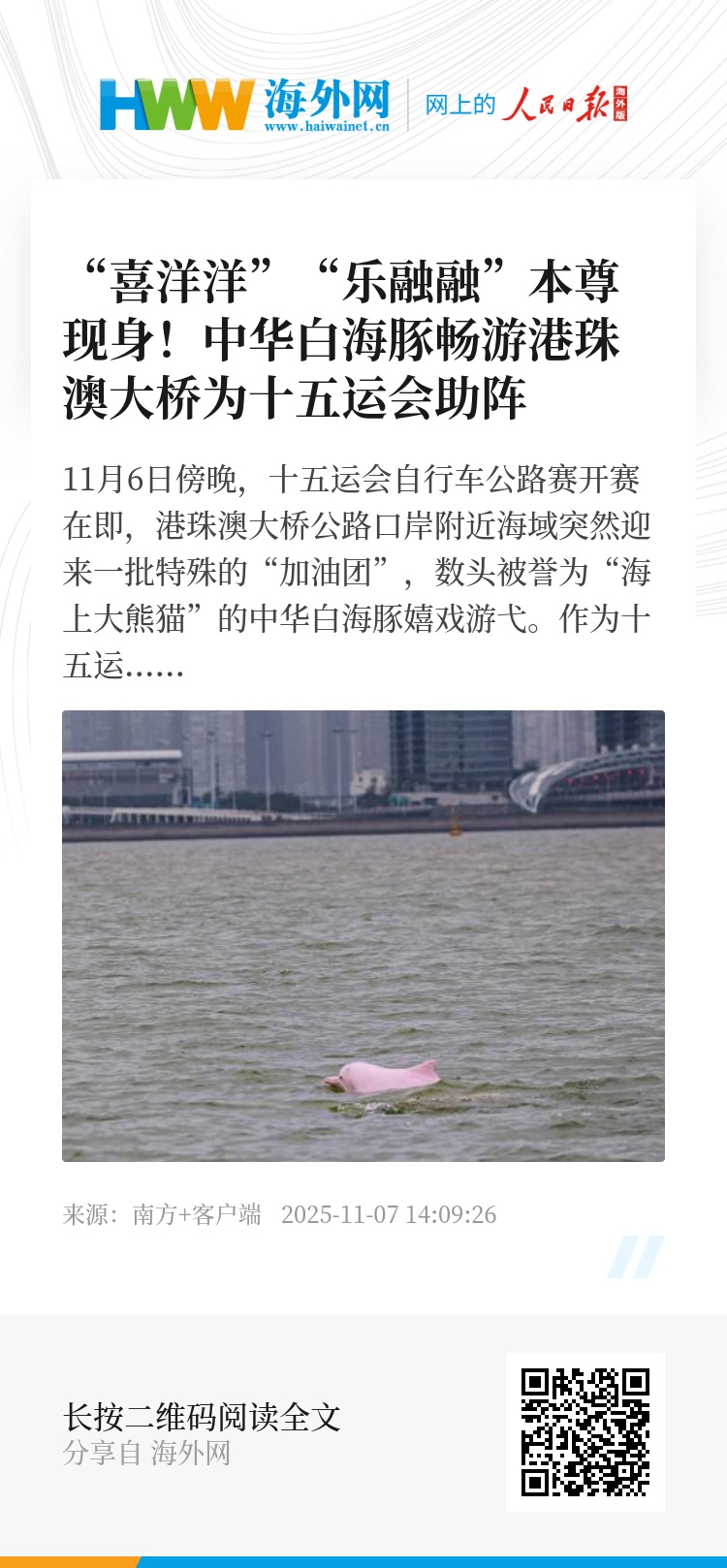 11月6日傍晚,十五运会自行车公路赛开赛在即,港珠澳大桥公路口岸附近海域突然迎来一批特殊的“加油团”,数头被誉为“海上大熊猫”的中华白海豚嬉戏游弋。