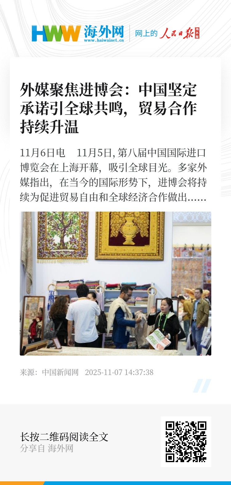 索维切特还强调:“此次国际贸易盛会真正体现了中国致力于促进全球贸易和多边主义、致力于进一步扩大中国市场对外开放的坚定承诺。”
