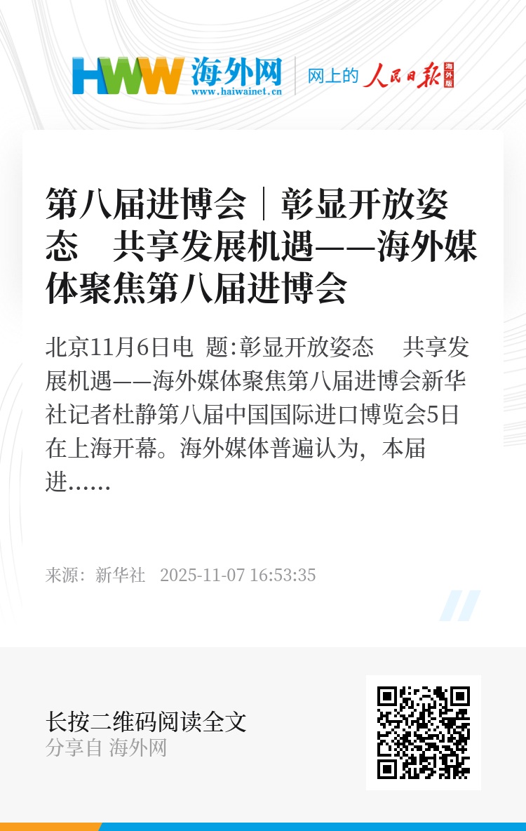 韩国《亚洲商业日报》报道指出,进博会印证了中国与全球经济深度融合、密不可分的发展大势,展示了中国扩大开放的决心。