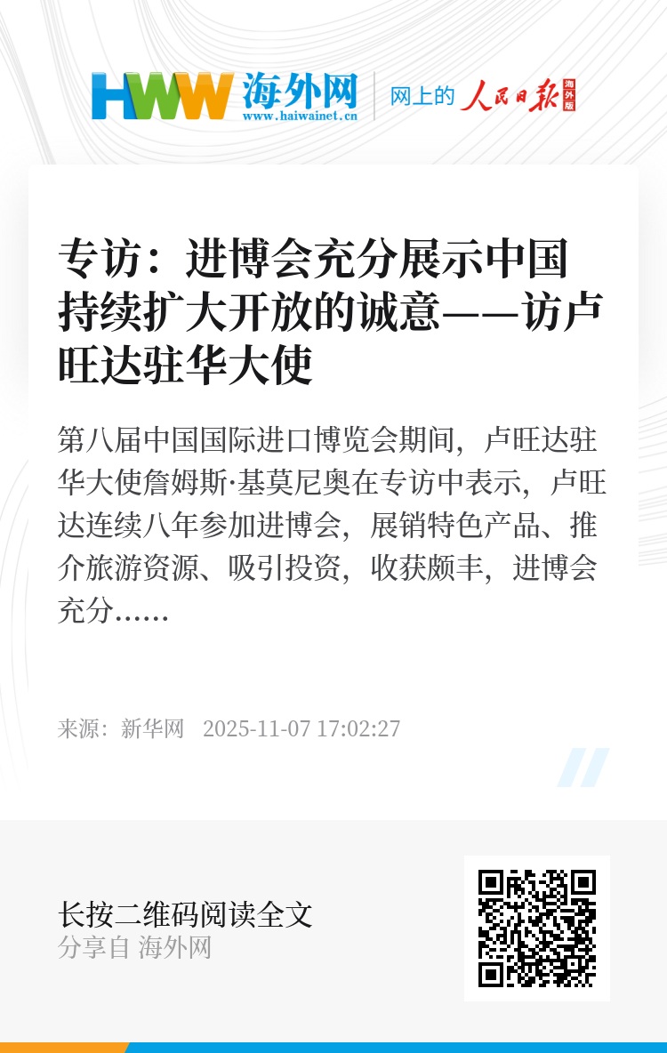 第八届中国国际进口博览会期间,卢旺达驻华大使詹姆斯·基莫尼奥在专访中表示,卢旺达连续八年参加进博会,展销特色产品、推介旅游资源、吸引投资,收获颇丰,进博会充分展示了中国持续扩大开放的诚意。他还表示,除了贸易和投资之外,还希望在绿色科技和人工智能领域与中国加强合作。