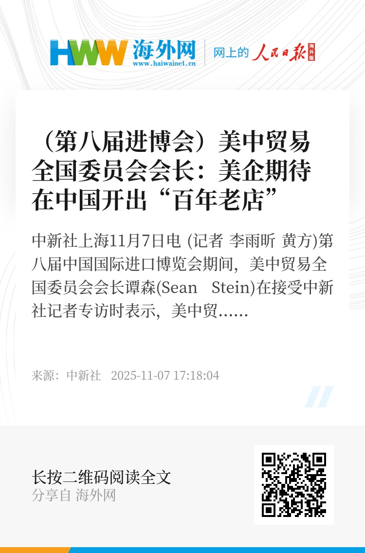 中新社上海11月7日电 (记者 李雨昕 黄方)第八届中国国际进口博览会期间,美中贸易全国委员会会长谭森(Sean Stein)在接受中新社记者专访时表示,美中贸易全国委员会的许多成员企业已在中国深耕50年,期待能够在中国再扎根50年甚至更久,开出“百年老店”。