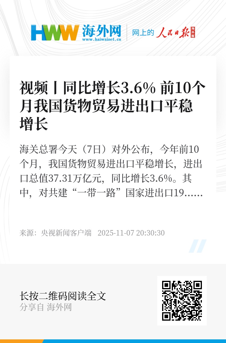 海关总署今天(7日)对外公布,今年前10个月,我国货物贸易进出口平稳增长,进出口总值37.31万亿元,同比增长3.6%。其中,