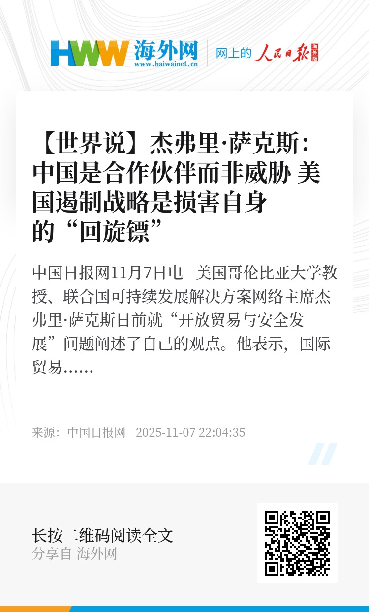 萨克斯回顾了十年前美国外交关系委员会发布的《调整美国对华大战略》一文,该文揭示了这种令人遗憾的政策转向。过去十年间,美国单方面加征关税、实施技术封锁、限制投资并打压中国企业,试图以此遏制中国发展。然而,这些政策并未奏效,反而如“回旋镖”般孤立了美国自身,并损害了全球共同繁荣的基础。