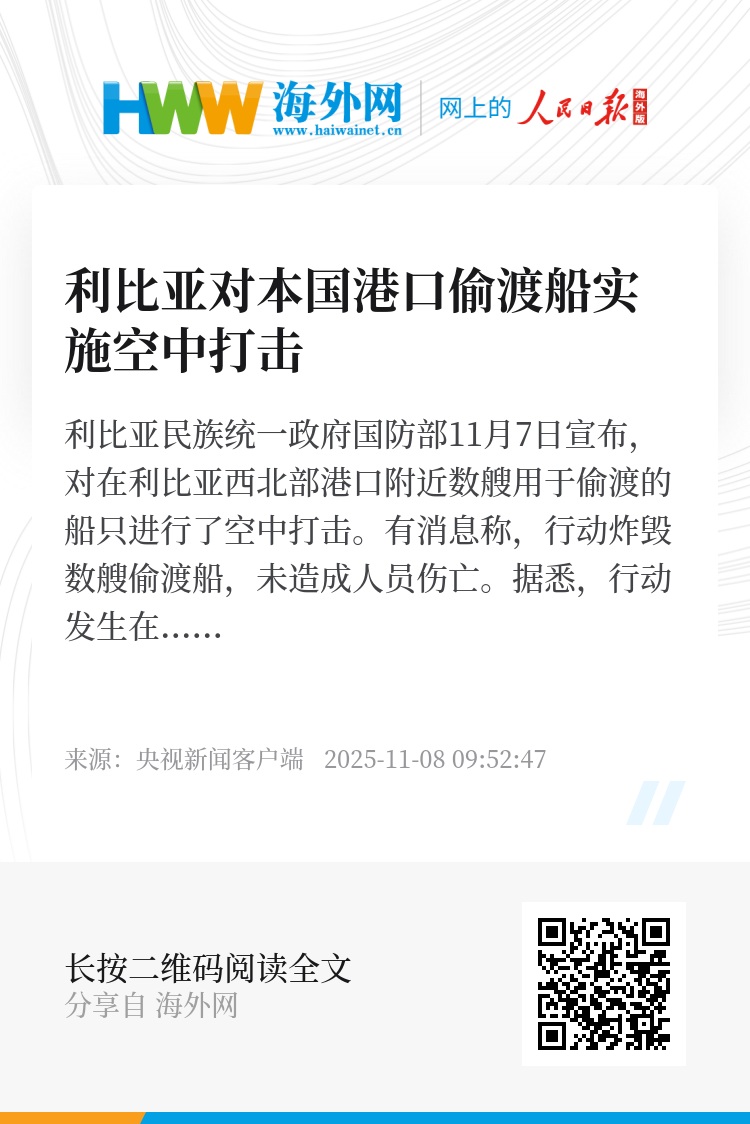利比亚民族统一政府国防部11月7日宣布,对在利比亚西北部港口附近数艘用于偷渡的船只进行了空中打击。有消息称,行动炸毁数艘偷渡船,未造成人员伤亡。
