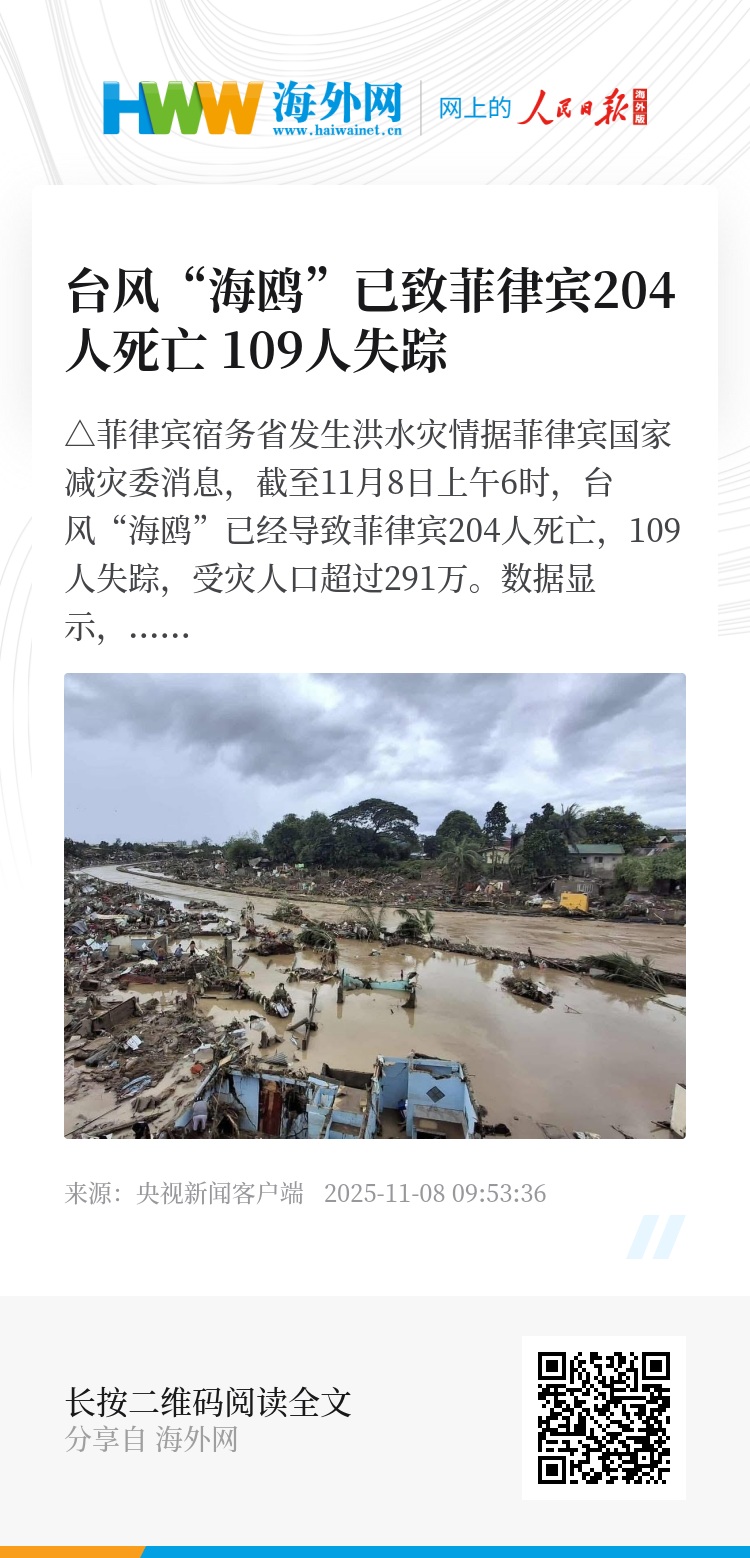 据菲律宾国家减灾委消息,截至11月8日上午6时,台风“海鸥”已经导致菲律宾204人死亡,109人失踪,受灾人口超过291万。