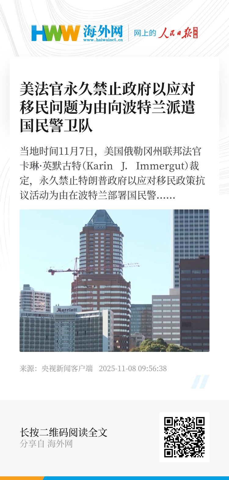 当地时间11月7日,美国俄勒冈州联邦法官卡琳·英默古特(Karin J. Immergut)裁定,永久禁止特朗普政府以应对移民政策抗议活动为由在波特兰部署国民警卫队。