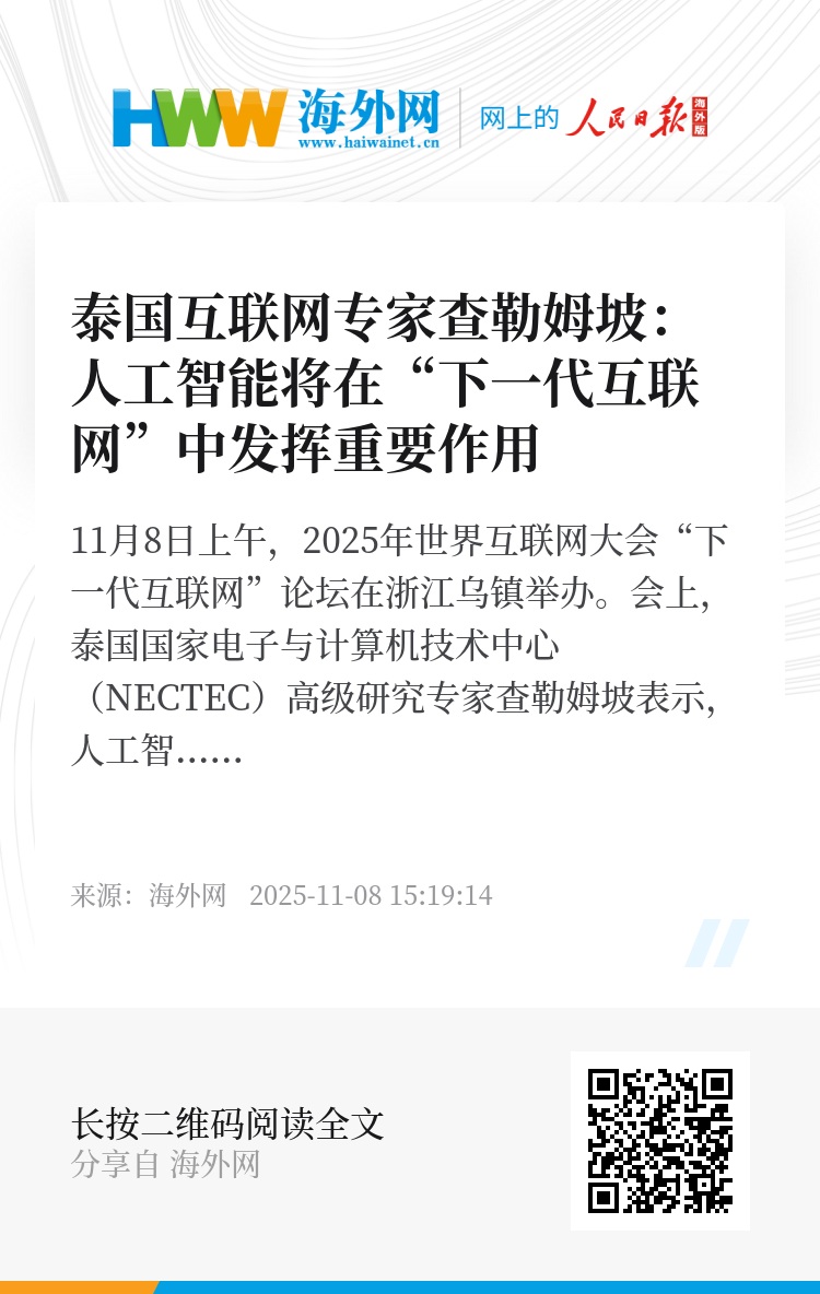 11月8日上午,2025年世界互联网大会“下一代互联网”论坛在浙江乌镇举办。会上,泰国国家电子与计算机技术中心(NECTEC)高级研究专家查勒姆坡表示,人工智能将在“下一代互联网”中发挥重要作用。