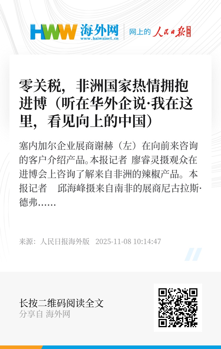 步入中国国际进口博览会现场,你能快速领略来自众多非洲国家的风情、好物。第八届进博会,是中国将零关税扩围至53个非洲建交国后的首届进博会。中国支持非洲建交国用足用好100%税目产品零关税政策,非洲企业参展数量同比增长80%。这场跨越大洋的“进博之约”,勾勒出中非合作互利共赢的新图景。