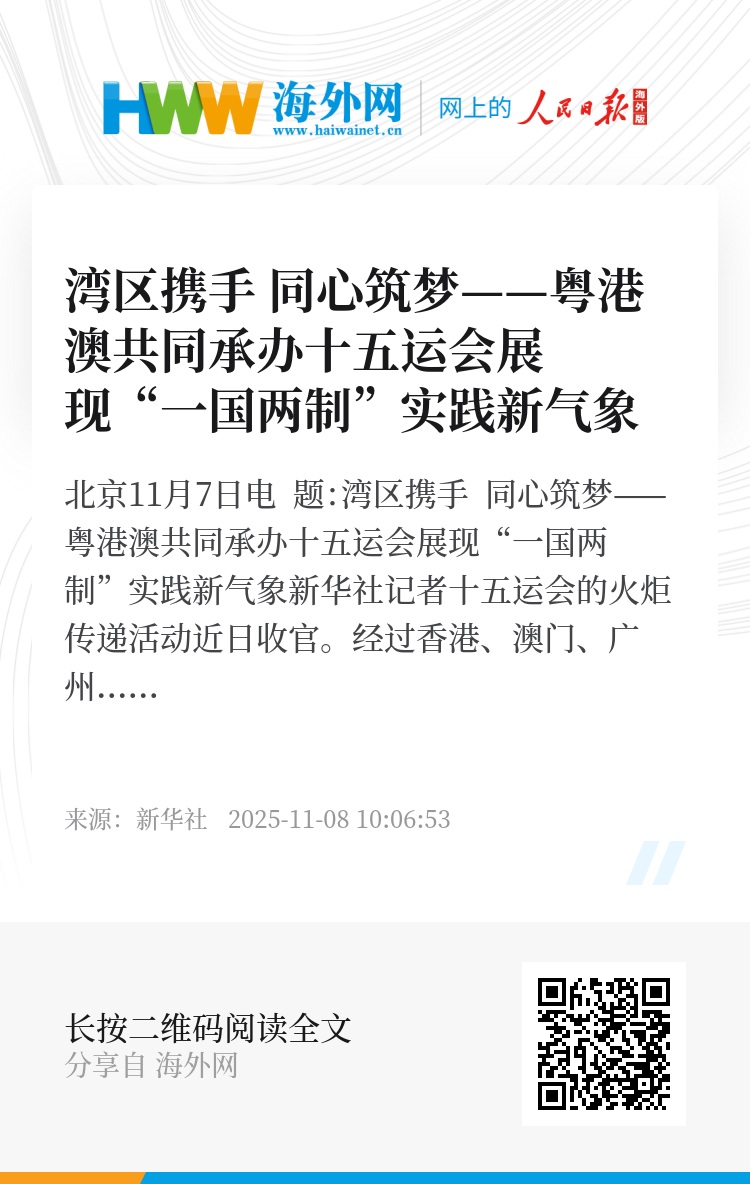 新华社北京11月7日电 题:湾区携手 同心筑梦——粤港澳共同承办十五运会展现“一国两制”实践新气象