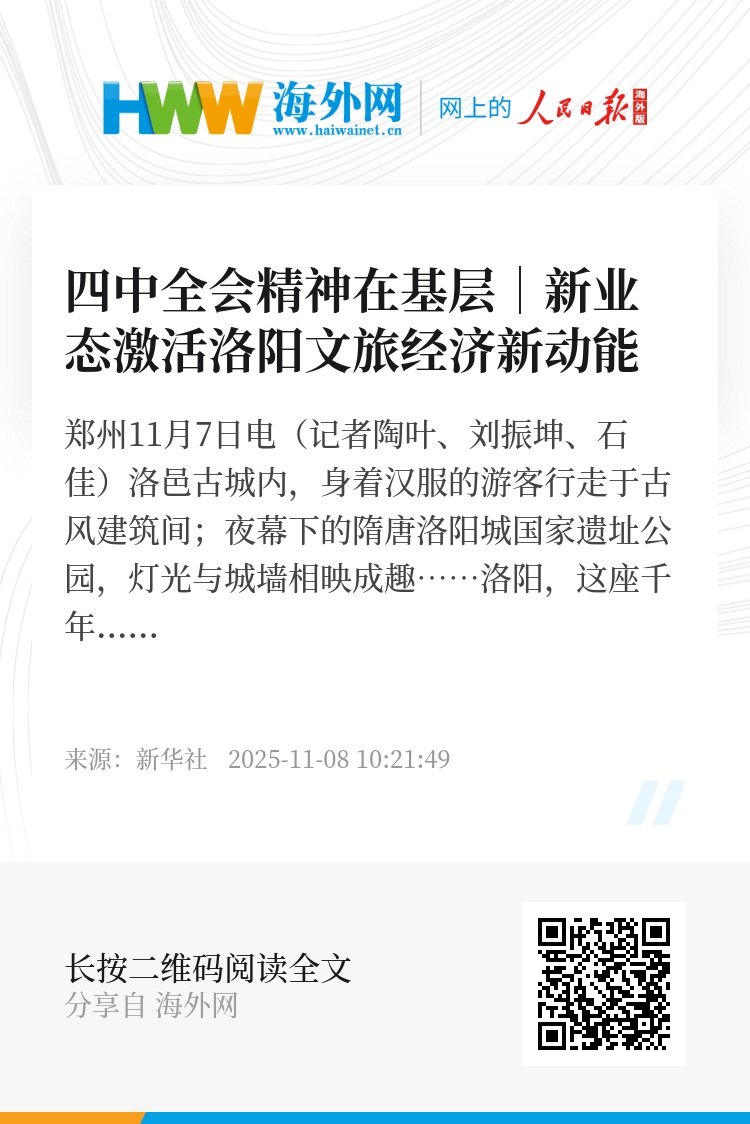 新华社郑州11月7日电(记者陶叶、刘振坤、石佳)洛邑古城内,身着汉服的游客行走于古风建筑间;夜幕下的隋唐洛阳城国家遗址公园,灯光与城墙相映成趣……洛阳,这座千年古城正以创新为笔、文化为墨,书写着文旅融合发展的崭新篇章,让历史文脉在当代焕发出蓬勃生机。