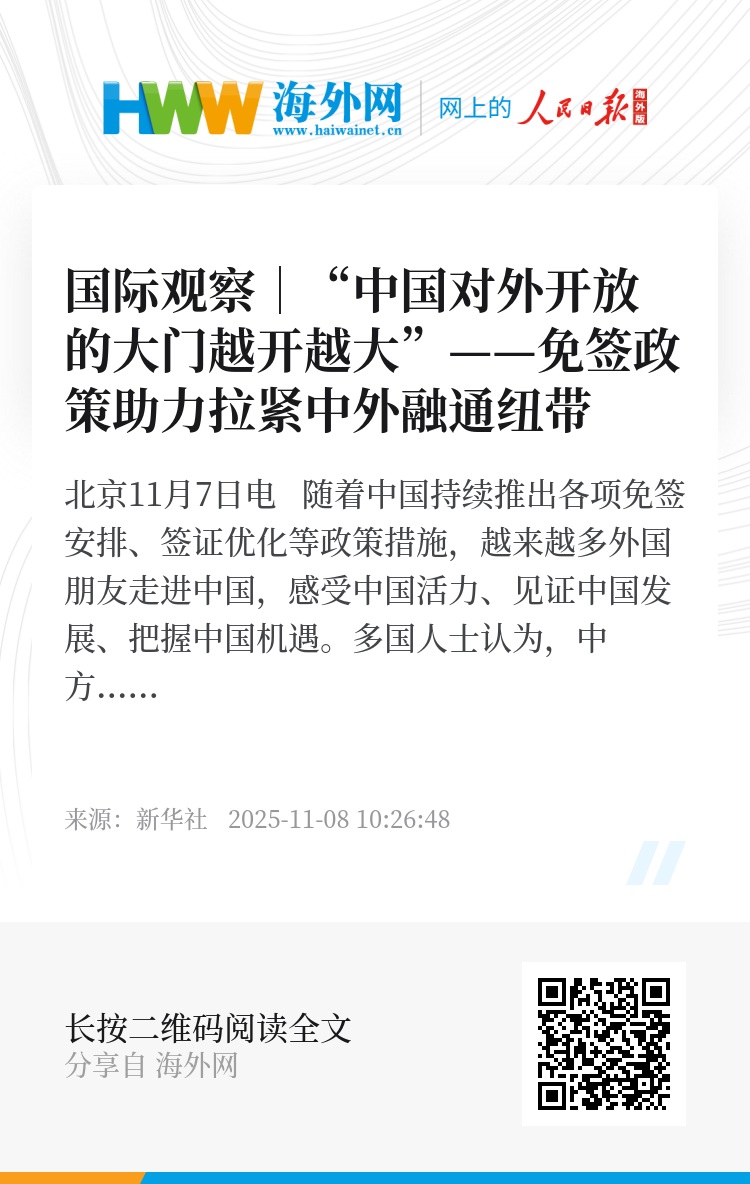 新华社北京11月7日电 随着中国持续推出各项免签安排、签证优化等政策措施,越来越多外国朋友走进中国,感受中国活力、见证中国发展、把握中国机遇。