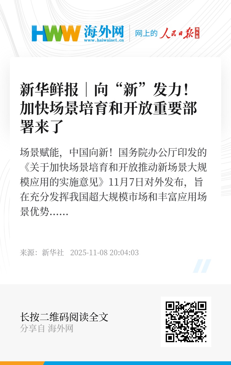 国务院办公厅印发的《关于加快场景培育和开放推动新场景大规模应用的实施意见》11月7日对外发布,旨在充分发挥我国超大规模市场和丰富应用场景优势,推动更多“应用场景”转变为“科创胜景”,激活中国高质量发展引擎。