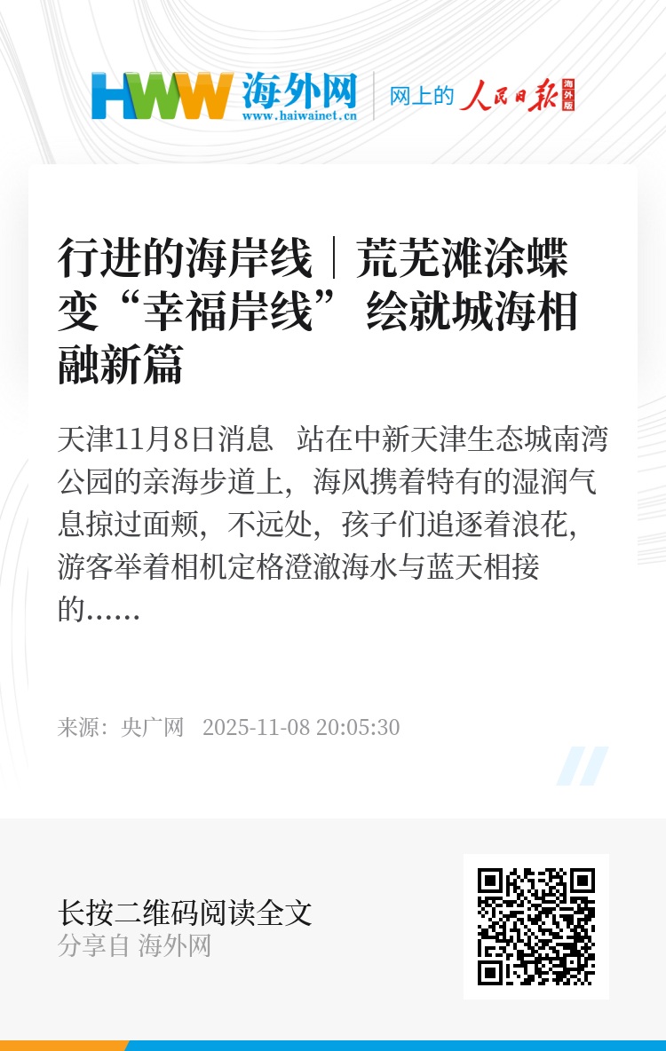 央广网天津11月8日消息 站在中新天津生态城南湾公园的亲海步道上,海风携着特有的湿润气息掠过面颊,不远处,孩子们追逐着浪花,游客举着相机定格澄澈海水与蓝天相接的画面——这幅充满生机的“海岸诗意图”,若与17年前的影像相比早已大不相同。彼时,这里还是一片荒芜滩涂,如今,36公里海岸线如丝带般串联起南湾公园等一座座亲海公园,沿线海水清澈透亮,入海口水质持续向好,成为“向海而生”的生动注脚。