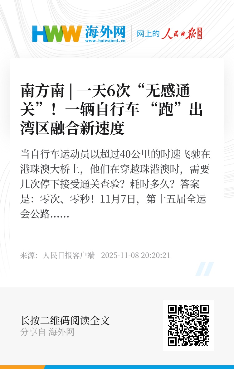 11月7日,第十五届全运会公路自行车赛在珠海拉开战幕,而11月8日举行的男子个人赛,是十五运会唯一跨越粤港澳三地的标志性跨境赛事,也是全运会历史上首次跨境赛事,运动员在231.8公里的赛程中6次经过口岸,却全程不停,无感通关。这背后,是一场关于通关模式的创新实践。