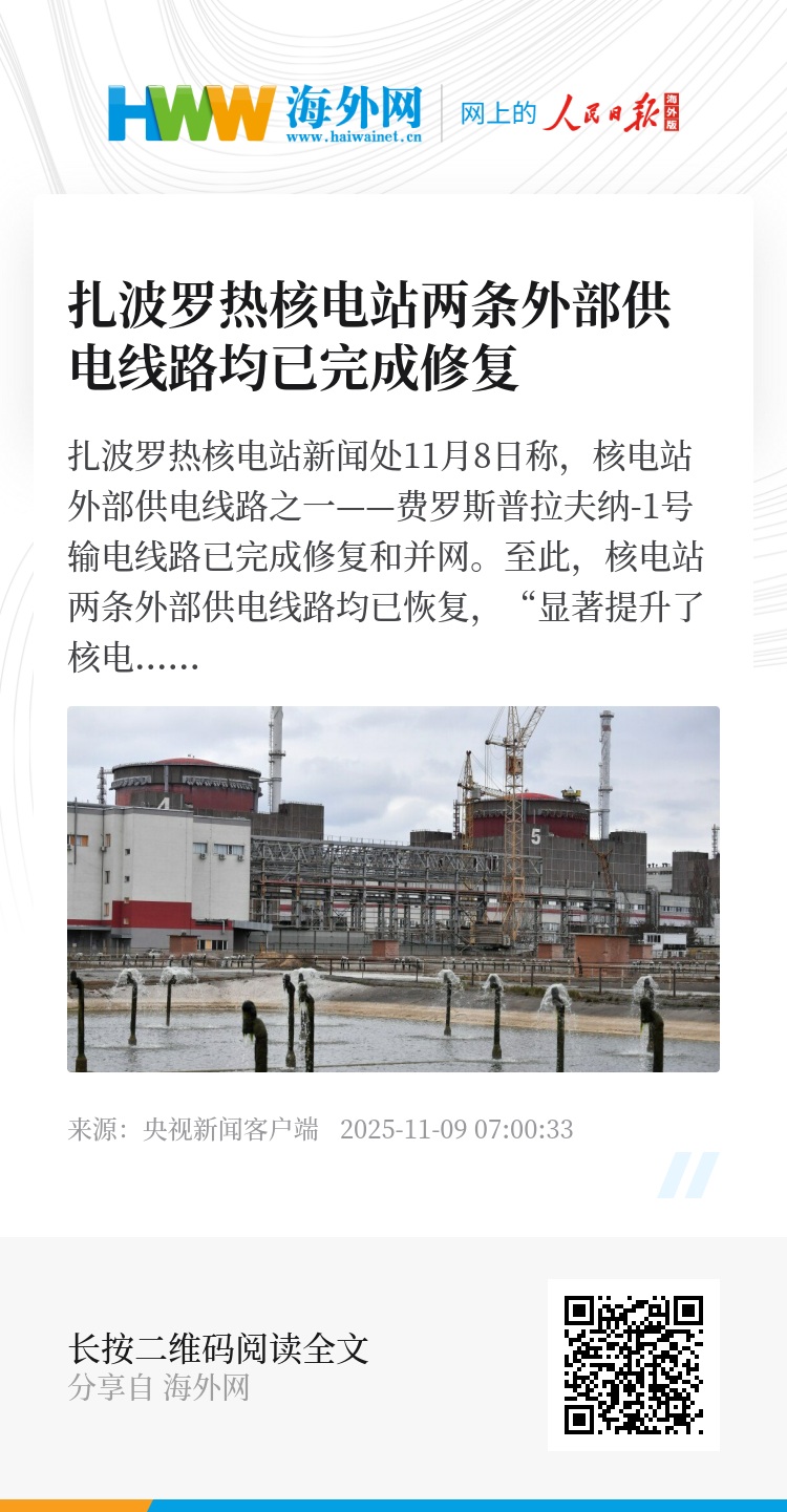 扎波罗热核电站新闻处11月8日称,核电站外部供电线路之一——费罗斯普拉夫纳-1号输电线路已完成修复和并网。至此,核电站两条外部供电线路均已恢复,“显著提升了核电站能源系统的稳定性”。
