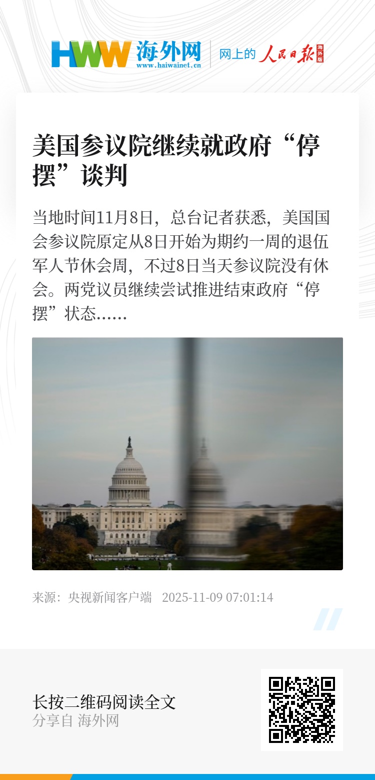 当地时间11月8日,总台记者获悉,美国国会参议院原定从8日开始为期约一周的退伍军人节休会周,不过8日当天参议院没有休会。两党议员继续尝试推进结束政府“停摆”状态的谈判,但进展有限。