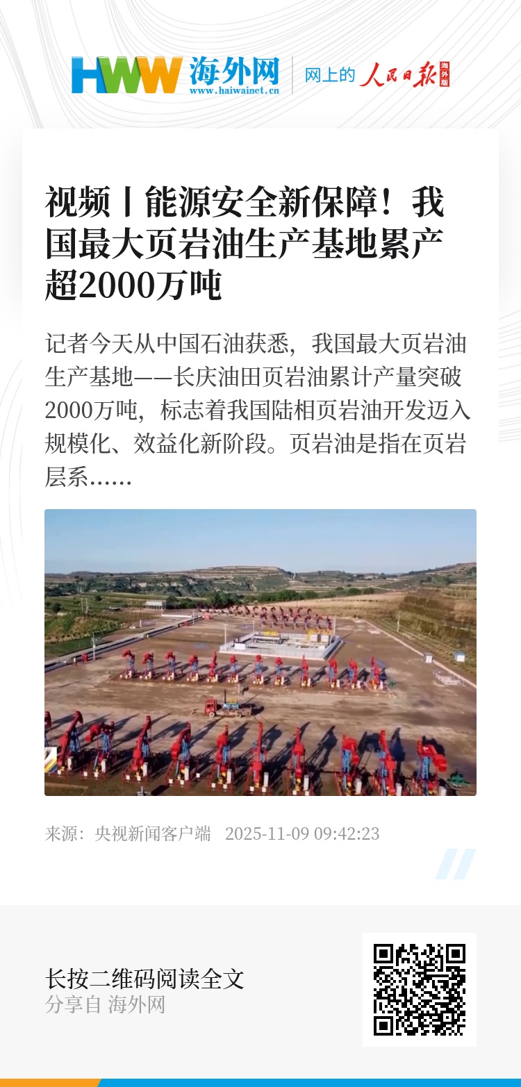 中国石油长庆油田公司油田开发事业部副经理 刘一仓:我们将持续加大页岩油勘探开发力度,预计到年末,长庆油田页岩油年产量有望突破350万吨,计划到2030年页岩油年产量达到450万吨,为我国能源安全再添新保障。