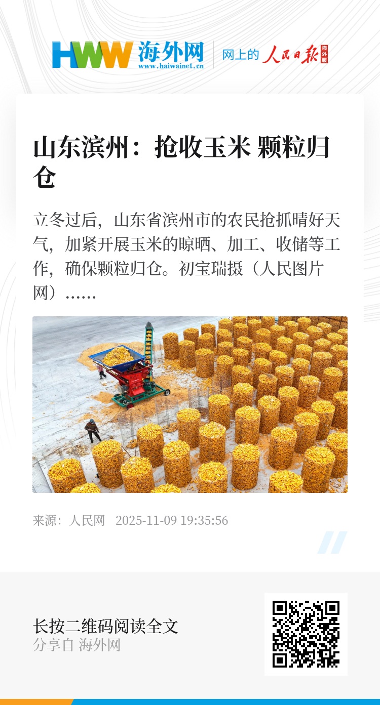 立冬过后,山东省滨州市的农民抢抓晴好天气,加紧开展玉米的晾晒、加工、收储等工作,确保颗粒归仓。初宝瑞摄(人民图片网)