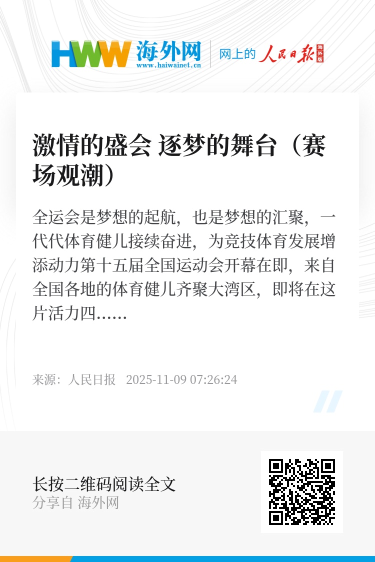 第十五届全国运动会开幕在即,来自全国各地的体育健儿齐聚大湾区,即将在这片活力四射的土地上释放激情、挥洒汗水。全运会是我国水平最高、规模最大、影响最广的体育赛事,初出茅庐的年轻人期待在赛场上崭露头角,荣誉闪耀的名将希望在这里再创佳绩。体育之梦在全运赛场汇聚,一场精彩的体坛盛会令人期待。