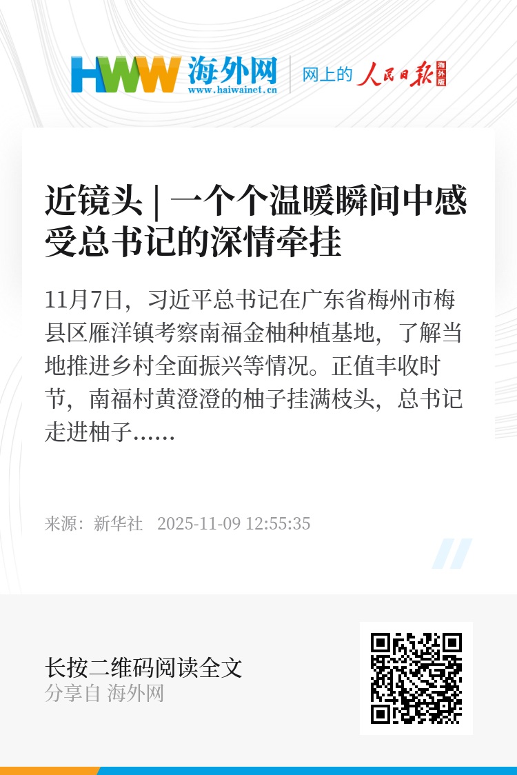 11月7日,习近平总书记在广东省梅州市梅县区雁洋镇考察南福金柚种植基地,了解当地推进乡村全面振兴等情况。正值丰收时节,南福村黄澄澄的柚子挂满枝头,总书记走进柚子林,同乡亲们亲切交流。