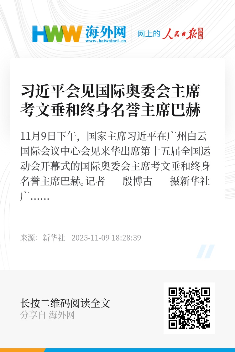 新华社广州11月9日电(记者孙奕、周强)11月9日下午,国家主席习近平在广州白云国际会议中心会见来华出席第十五届全国运动会开幕式的国际奥委会主席考文垂和终身名誉主席巴赫。