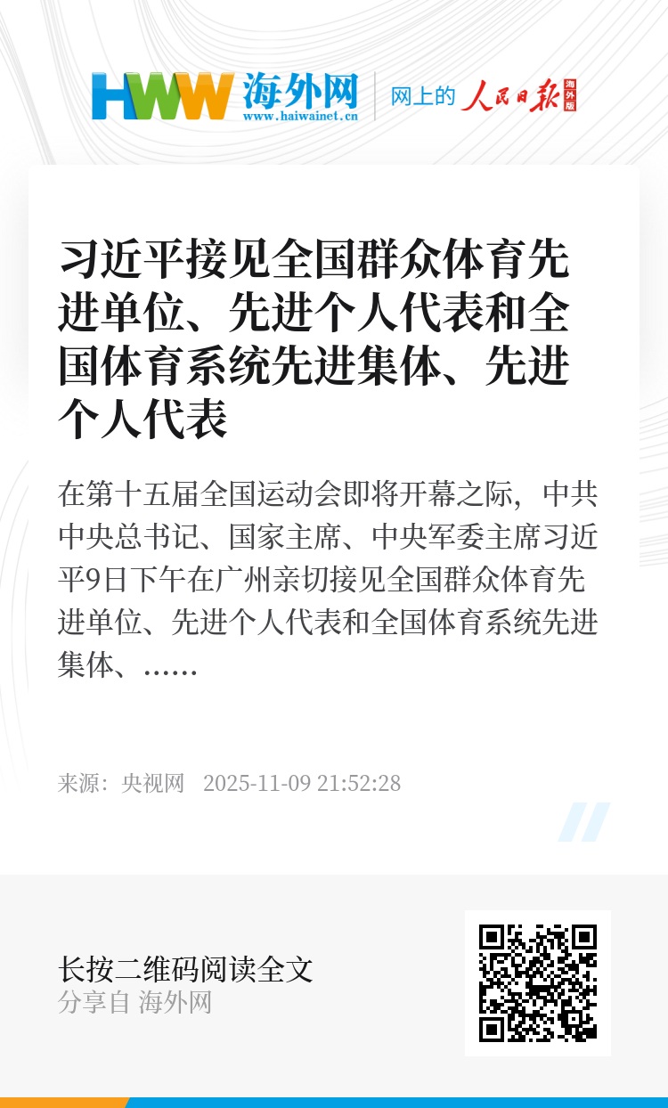 在第十五届全国运动会即将开幕之际,中共中央总书记、国家主席、中央军委主席习近平9日下午在广州亲切接见全国群众体育先进单位、先进个人代表和全国体育系统先进集体、先进个人代表,向他们表示热烈祝贺,勉励他们奋力拼搏、再创佳绩,为建设体育强国作出新贡献。