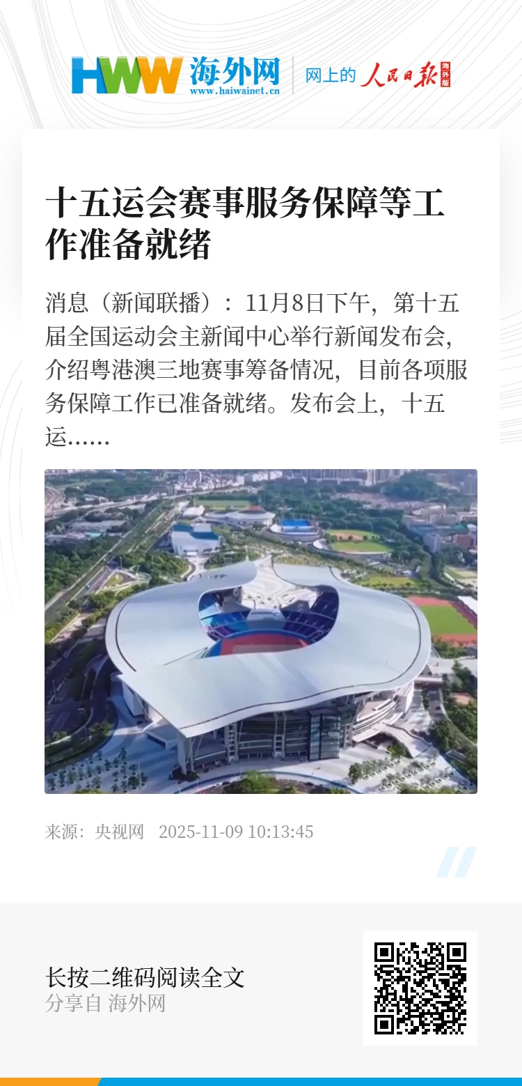 央视网消息(新闻联播):11月8日下午,第十五届全国运动会主新闻中心举行新闻发布会,介绍粤港澳三地赛事筹备情况,目前各项服务保障工作已准备就绪。