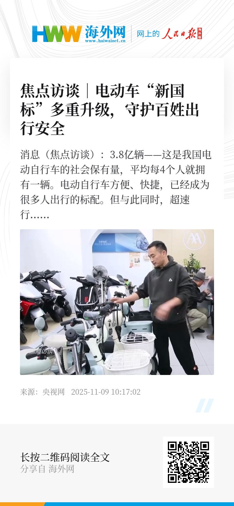 央视网消息(焦点访谈):3.8亿辆——这是我国电动自行车的社会保有量,平均每4个人就拥有一辆。电动自行车方便、快捷,已经成为很多人出行的标配。但与此同时,超速行驶、非法改装引发的交通事故、电池起火导致的生命财产损失,也让电动自行车安全问题成为社会关注的焦点。2025年9月1日,新版《电动自行车安全技术规范》正式实施,这部被称为“史上最严”的新国标,落地两个多月来,企业和消费者都在经历一场看得见的变化。