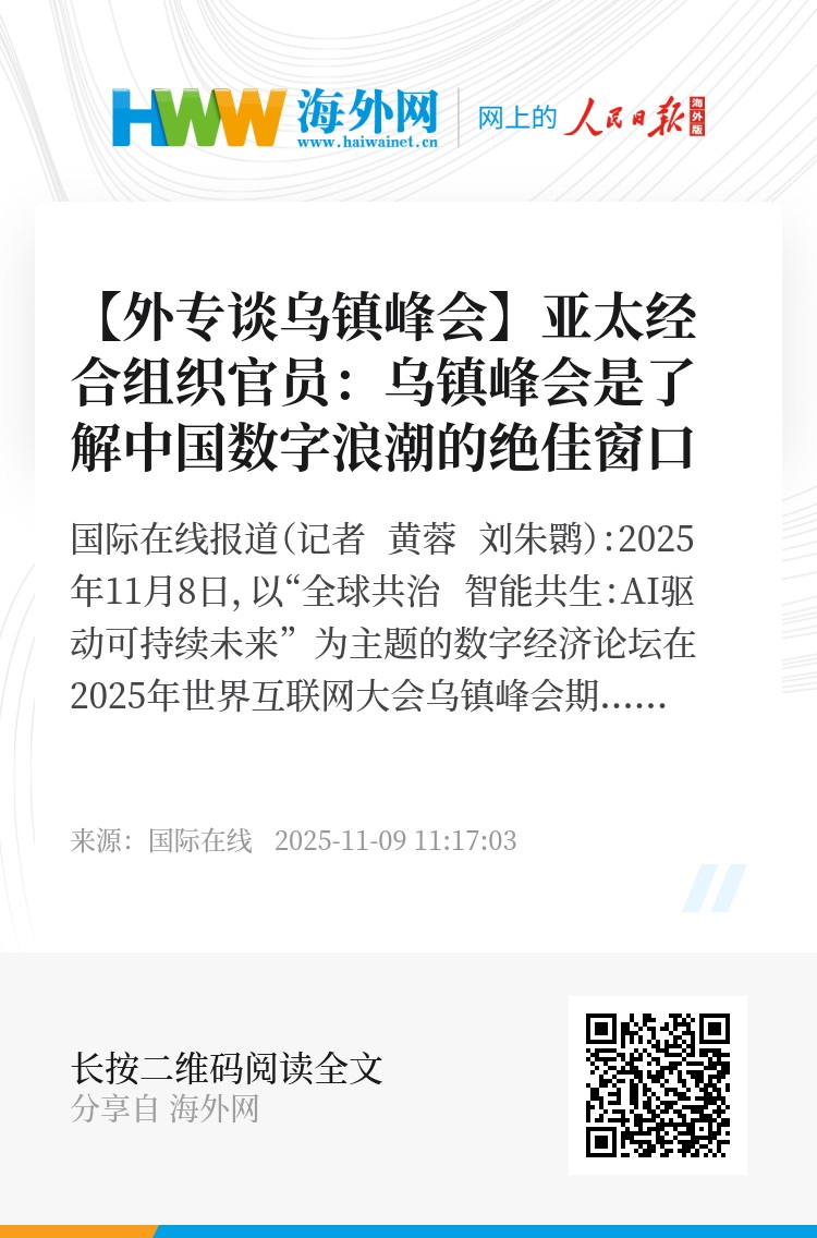 国际在线报道(记者 黄蓉 刘朱鹮):2025年11月8日,以“全球共治 智能共生:AI驱动可持续未来”为主题的数字经济论坛在2025年世界互联网大会乌镇峰会期间举办。亚太经合组织数字经济指导小组项目主任埃尔佩斯·戴维森在论坛上表示,乌镇峰会是了解中国数字浪潮的绝佳窗口。埃尔佩斯说,乌镇峰会期间,政商学界的代表们充分交流,与会嘉宾可以了解到数字经济领域的最新理念、创新成果以及实践经验,为包括亚太经合组织在内的许多国际组织的数字经济工作提供有益借鉴。